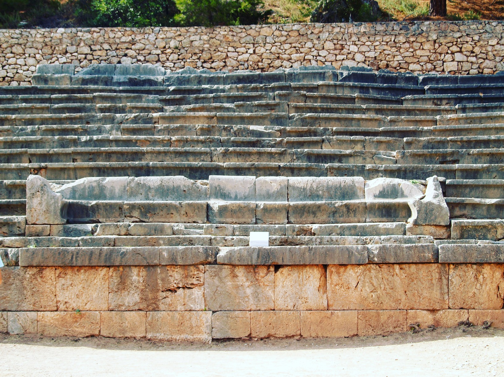 Cautiva igualmente el recinto del teatro, cuya construcción inicial se remonta al cuarto siglo antes de la era común y cuyas gradas podían acoger hasta 5.000 espectadores, que disfrutarían de las funciones escénicas y musicales contemplando al fondo el marco incomparable de las estribaciones montañosas del valle del Pleistos.
