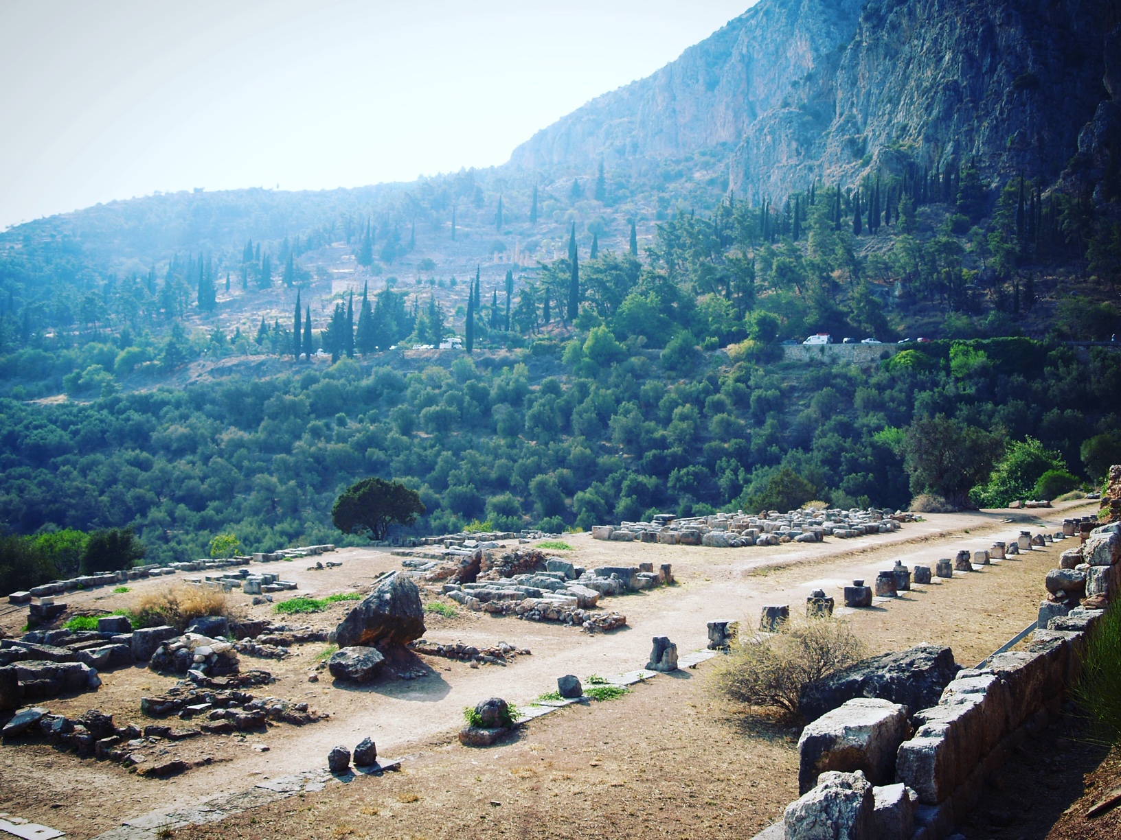 Las ruinas de la antigua ciudad santuario, otrora epicentro del mundo helénico, descansan en una serie de terrazas de diferentes niveles ceñidas a la orografía de la ladera del monte Párnaso y conectadas por la Vía Sacra, que recorre en zigzag el recinto como ascendente camino ceremonial del peregrinaje al oráculo.