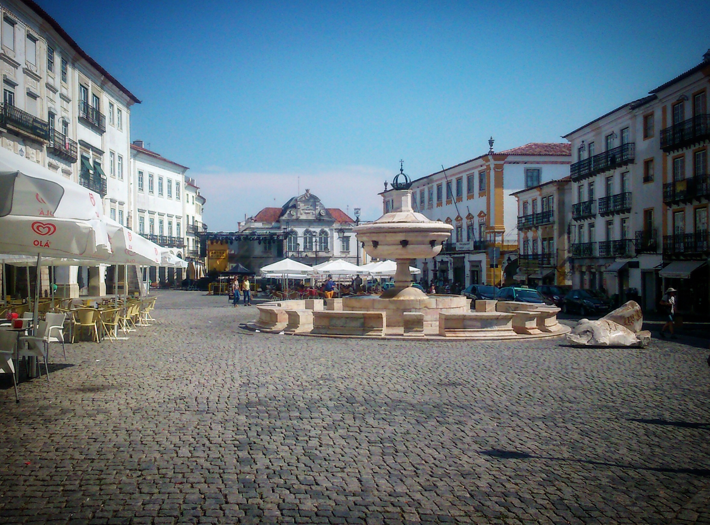 La plaza, coronada por su emblemática fuente barroca y flanqueada por la iglesia renacentista de Santo Antão y la elegante sede local de la Agencia del Banco de Portugal, constituye un buen punto de partida desde el cual comenzar a conocer la ciudad, a través de su recogida arcada repleta de bares y comercios y su calzada de tradicional empedrado luso.