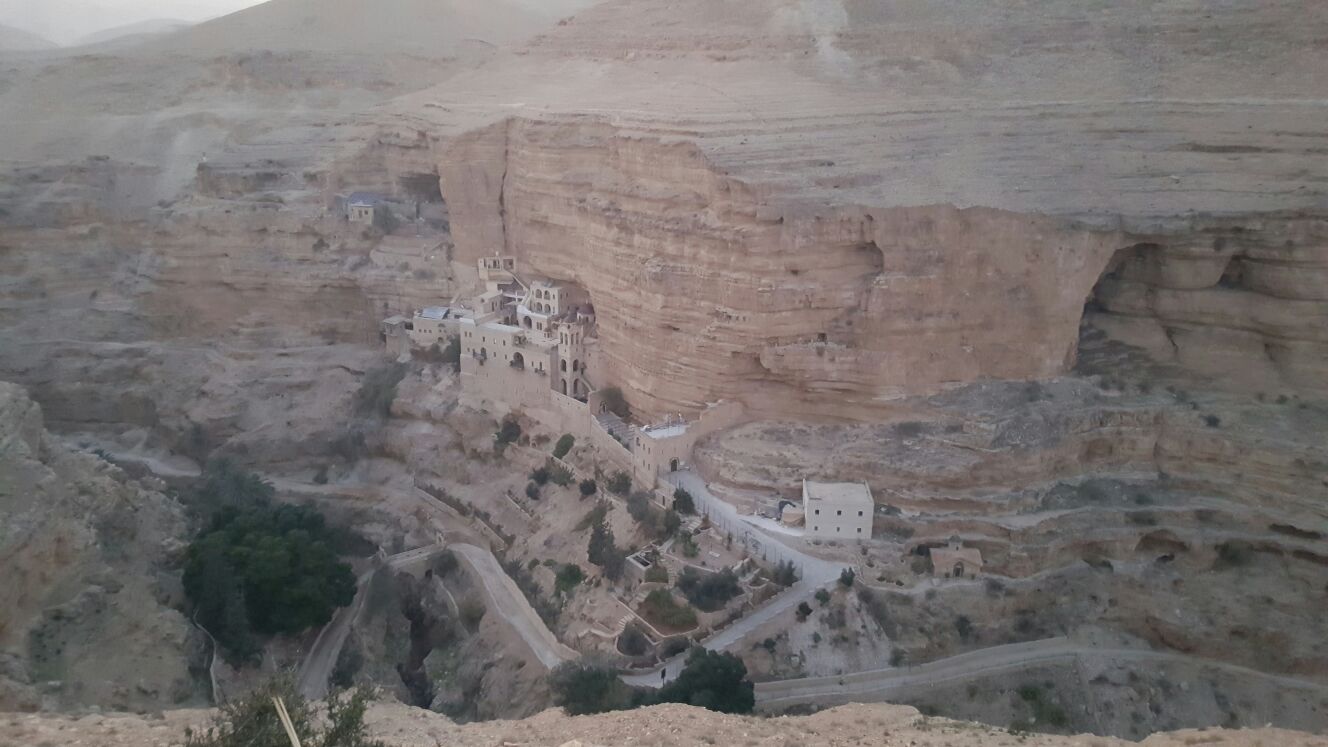 Vista del Monte de la Tentación, ubicado en Cisjordania junto a Jericó, con el monasterio griego ortodoxo excavado en la roca