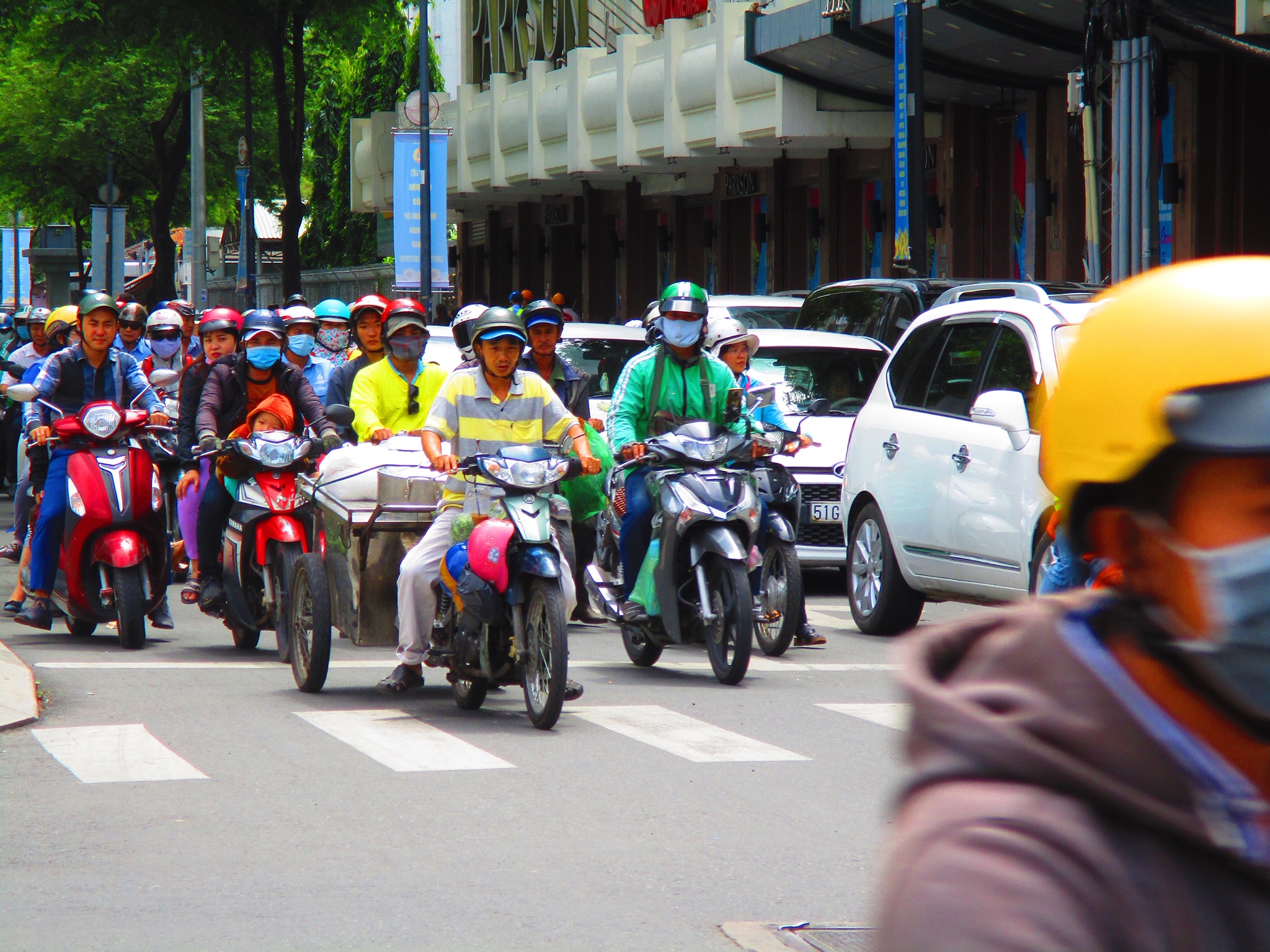 La contrapartida es que sean de las ciudades más contaminadas del mundo, por lo que las mascarillas son un complemento indispensable de los motoristas y viandantes vietnamitas, que también acostumbran a cubrirse con mangas largas, pese al calor tropical. Junto a la contaminación, los rayos ultravioletas del sol son sus grandes enemigos.